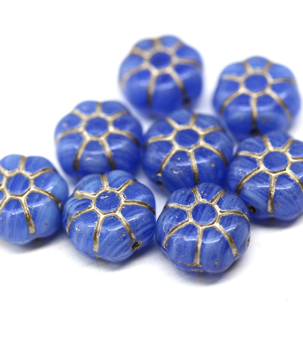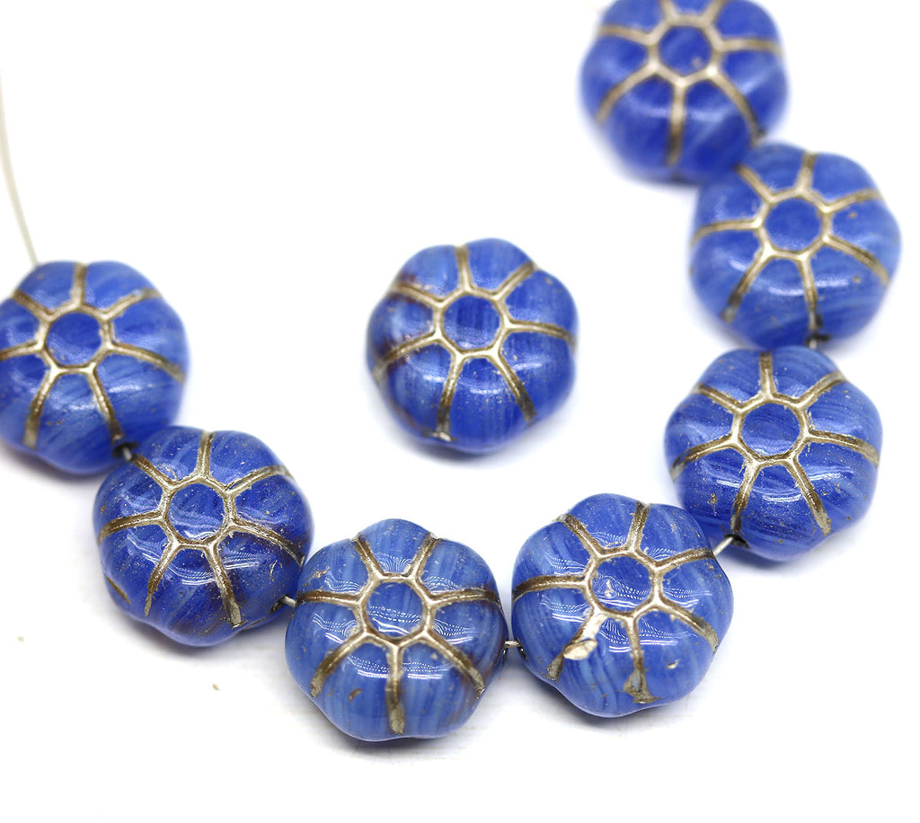 12mm Blue puffy pansy flower czech glass, Silver inlays 8pc