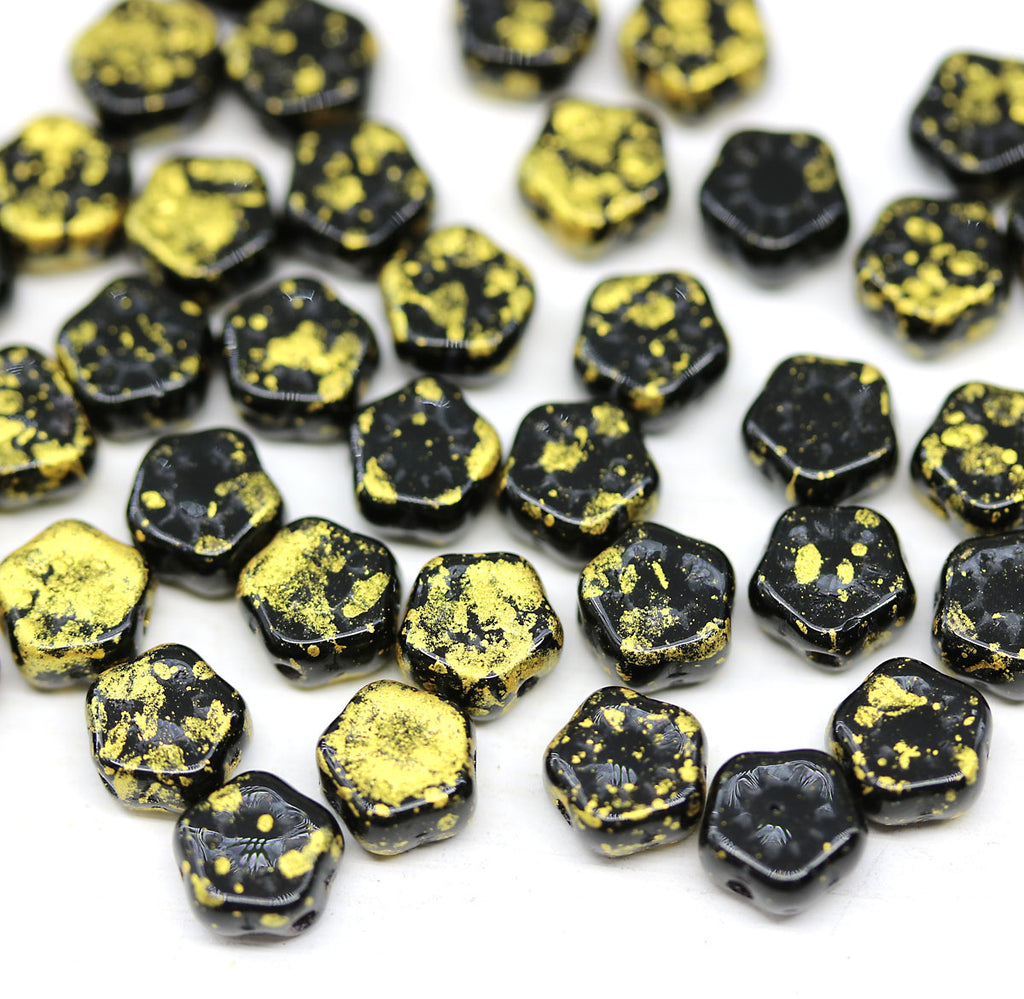 6mm Black daisy flower czech glass beads, Gold wash 40pc